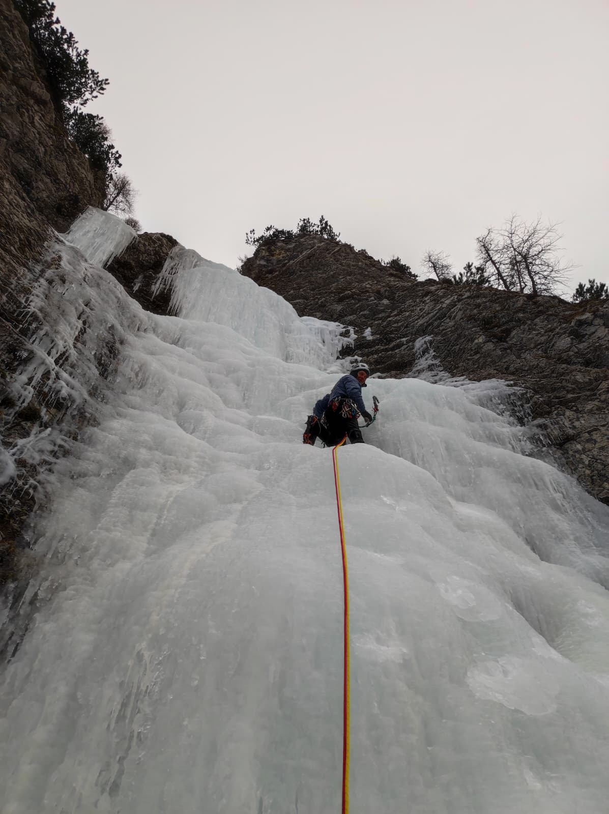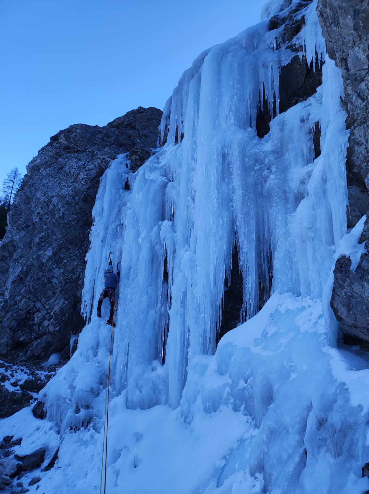 Prva dva raztežaja sta bila zelo lahka in lepo plezljiva, led je bil tudi super. V tretjem, bolj strmem raztežaju pa je bilo bolj “leščurjasto” in zaradi tega bolj krušljivo in tehnično zahtevno. Malo strahospoštovanja nam je dajal tudi “meč” – sveča, po kateri nosi tudi slap ime. Ker smo imeli še dve navezi pod sabo, nam je bilo malo neprijetno in strah, da bi kaj vrgli nanje. Za zadnji raztežaj smo izbrali lažjo in bolj položno varianto, z zanimivim začetnim prehodom iz pod sveče. Slap se konča pri drevesu, od kjer po potki proti levi in sestapanju po grapi pridemo do abzajla in se od tam spustimo, kot bi rekel moj tata: “direkt u šwlne”.