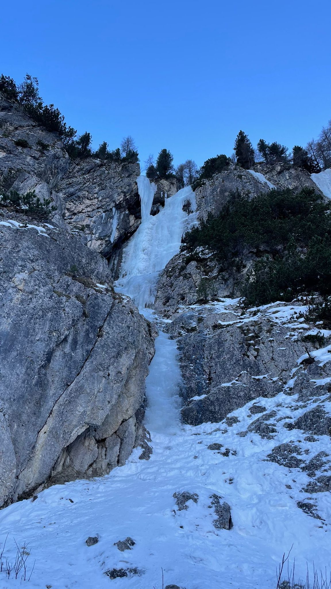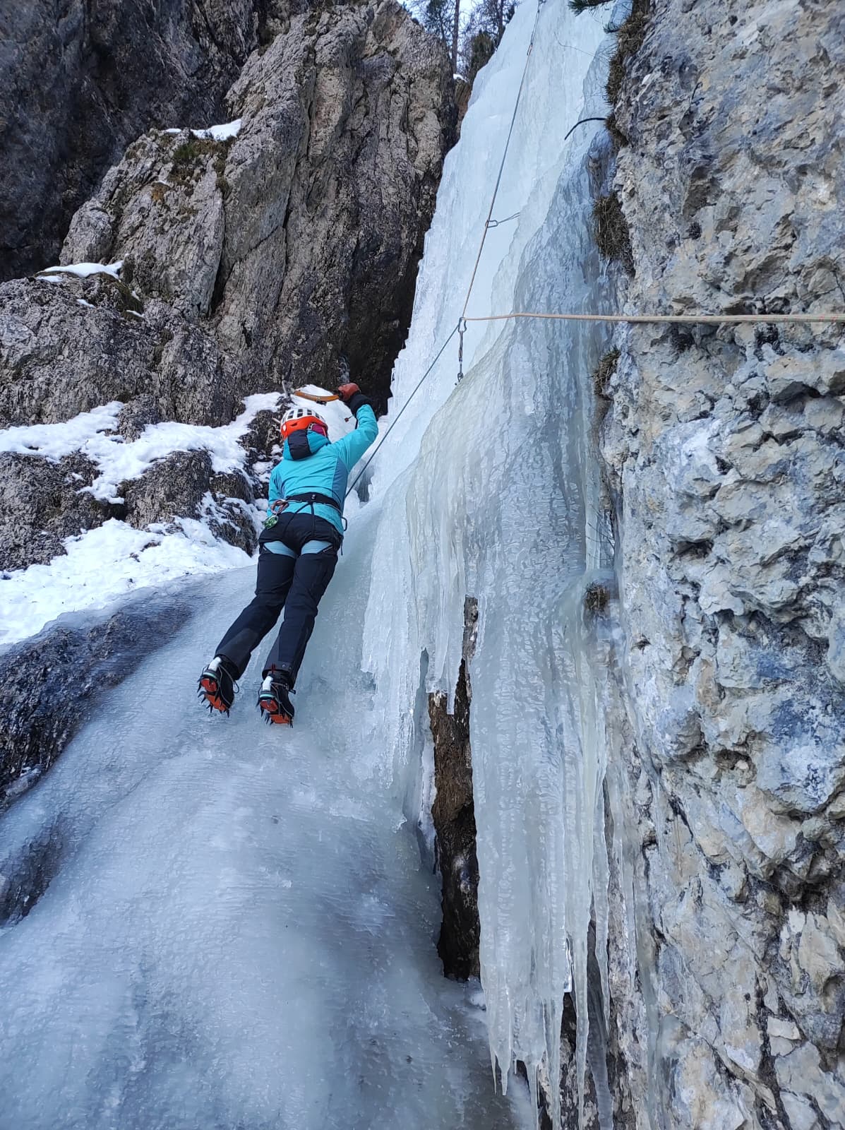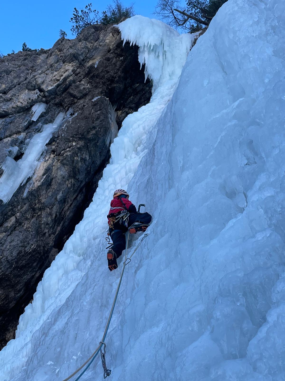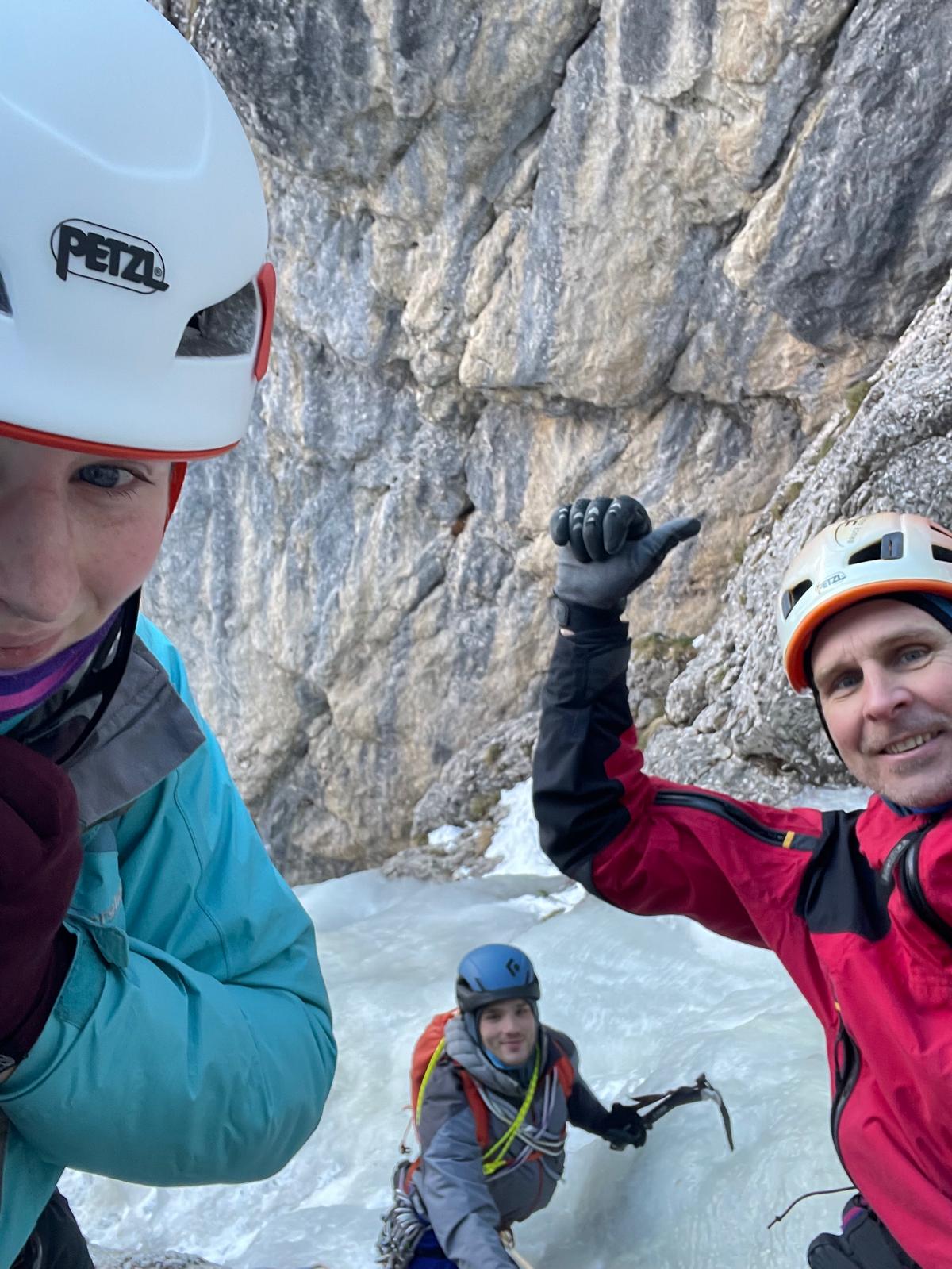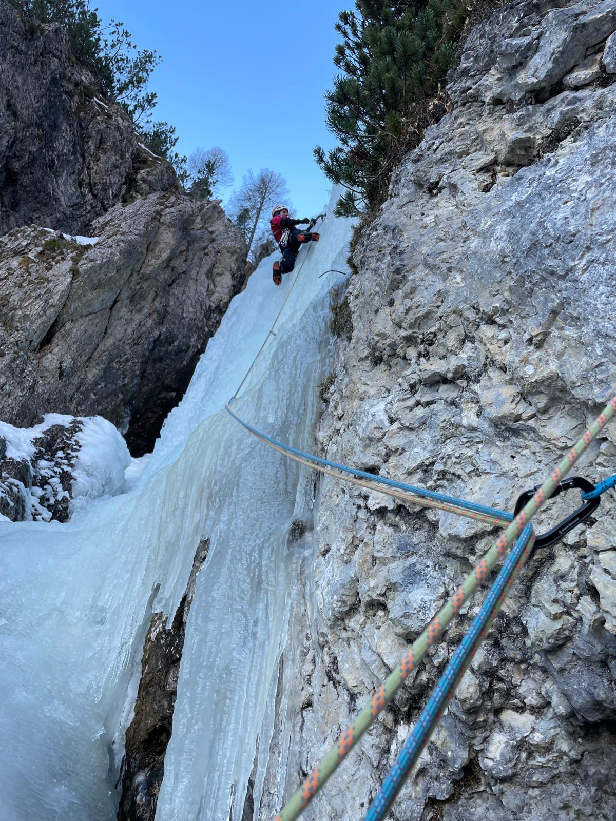 V nedeljo so se nam pridružili še moji starši in z Lukcem sva zamenjala smučanje za ledno plezanje. Tata si je že po poti do apartmaja ogledoval slapove ki so mu bili “na poti” in ugotovil, da zaradi viskoh temperatur, razen v Dolomitih, ni nič dobro narejeno.