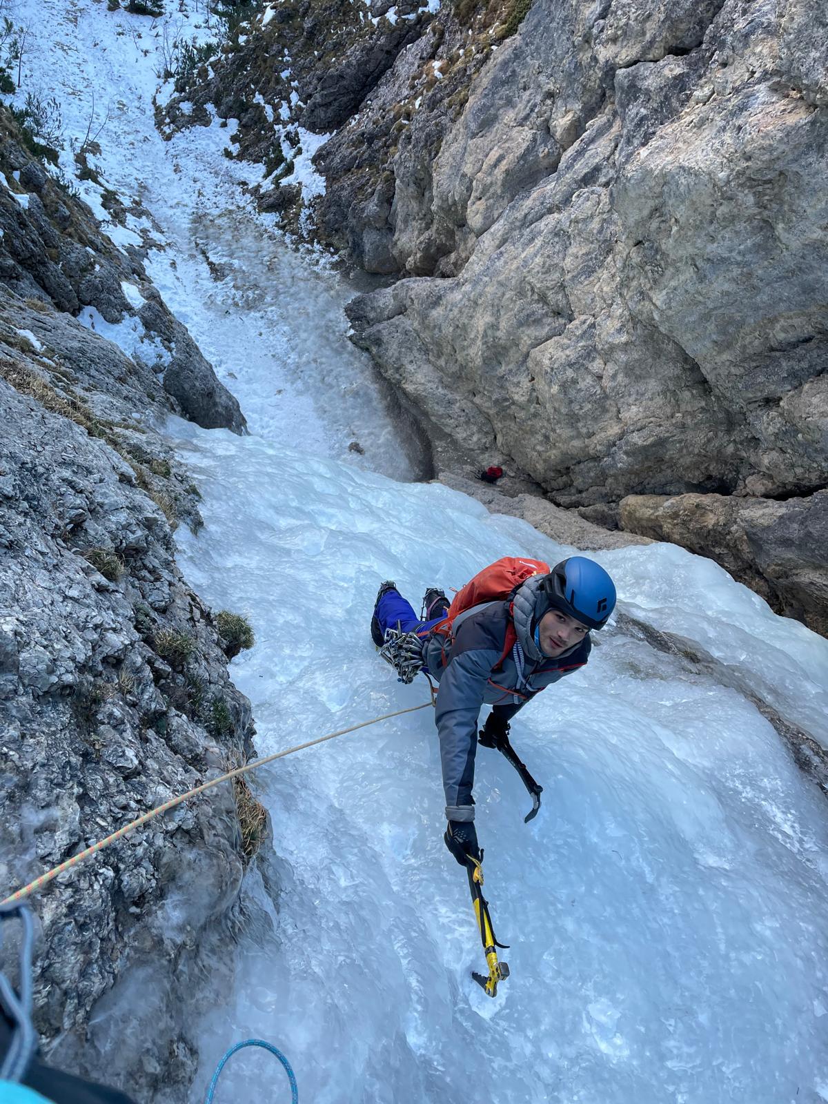Potegnemo prvič, drugič, tretjič – tudi z vso težo – vendar se ni premaknil. Očitno je zmrznil. Situacija ni bila prijetna, saj se je zunaj že začelo temniti, čelke pa sva imela spravljene v nahrbtniku pod slapom. To je pomenilo, da mora nekdo splezati nazaj gor in štrik odlepiti od ledu. Drejc je zato, kolikor hitro je šlo, z reversom poprusikaril kakšnih 25 metrov navzgor, odlepil štrik in se spustil nazaj dol.