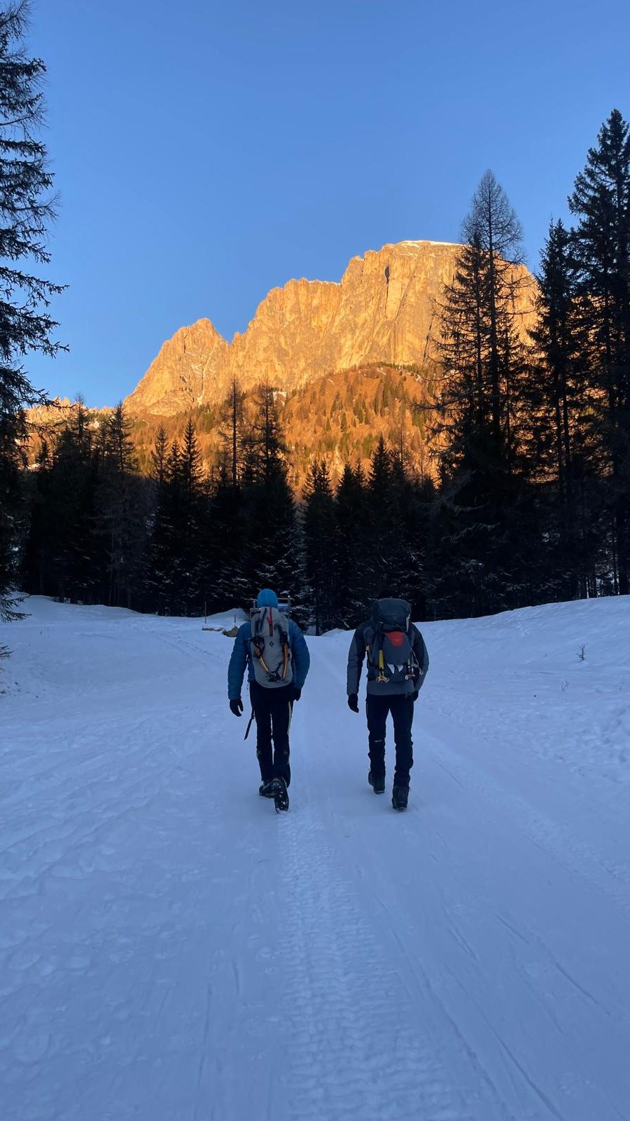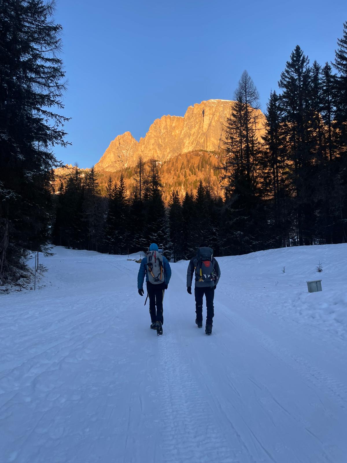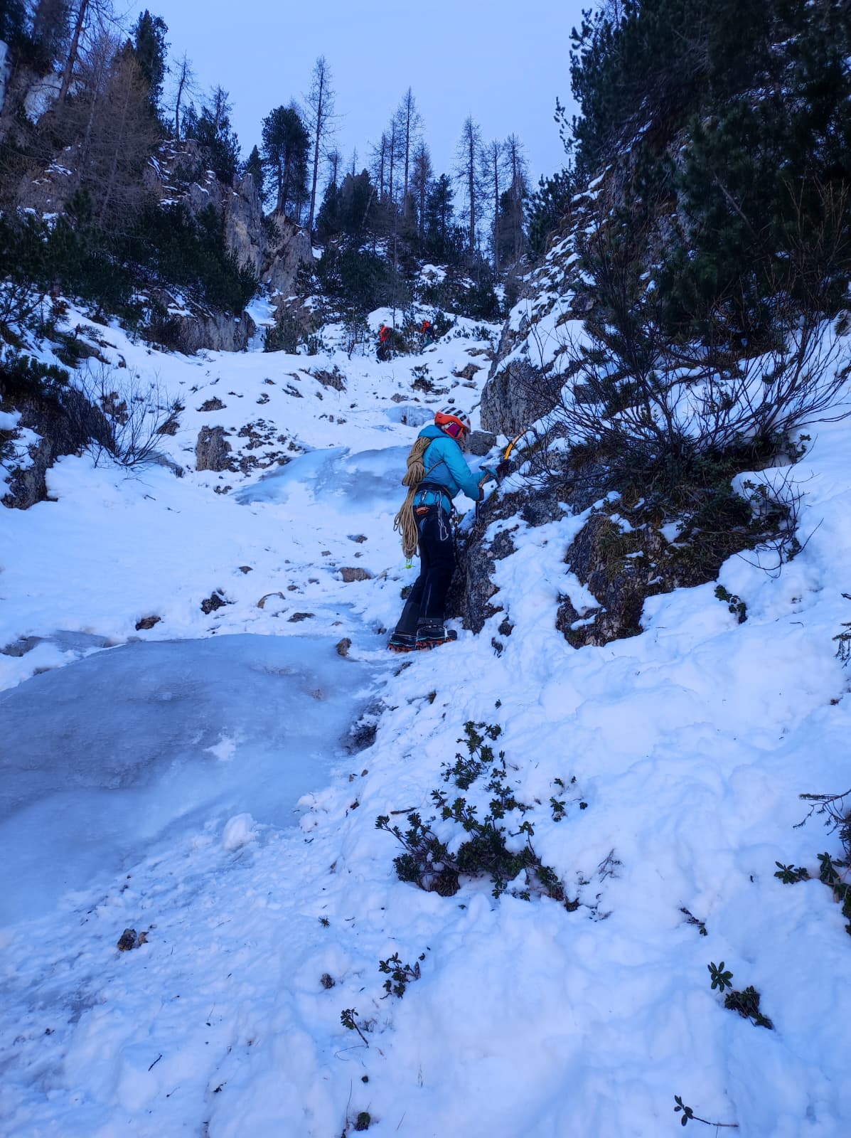 Po plezanju »obcestnih« slapov smo si zaželeli kakšne malo lepše ture, zato smo se 8. januarja dve navezi (Katarina in Zlatko Koren ter Jernej Arčon – Drejc in Luka Vuk) odpravili do vasi Campolongo malo naprej od Sappade, kjer smo začeli dostop do amfiteatra slapov pod goro Monte Col. Jutro je bilo zelo mrzlo, v kombiju je termometer kazal -16 °C, vendar nas je strm dostop hitro segrel. Nekoliko kasneje kot po pričakovanjih smo bili okoli 11 ure pod slapovi, kar pa je blo ravno dovolj, da so bile naveze, ki so že plezale, ustrezno visoko.
